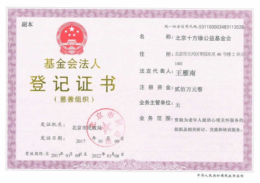 十方缘公益基金会注册登记证书