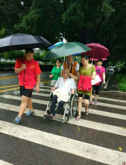 整理好吴伯的清洁工作后,我们整装待发了,吴伯腿脚不便,本次依然由我们的男一号大力士何菊华承“背”,这样足够给到吴伯安全感。到楼下后,叶子姐等女同志给吴伯打伞,其他人给推车的人打扫。我们就是在这种团结协作下,冒着雨抵达了预定的酒店,准备开始我们的早茶兼生日庆祝会。