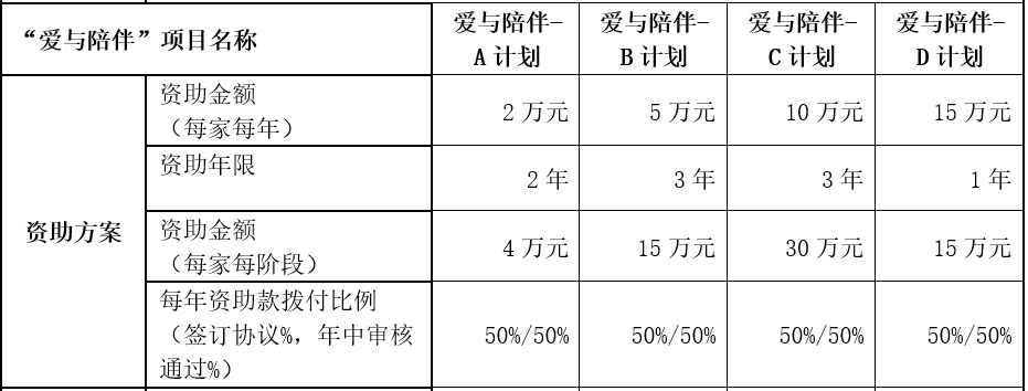 2019年爱与陪伴项目经过初审、项目计划书审核/数据审核、路演、实地考察、终审的综合评审,获得资助机构的名单、资助计划和资助金额公示: