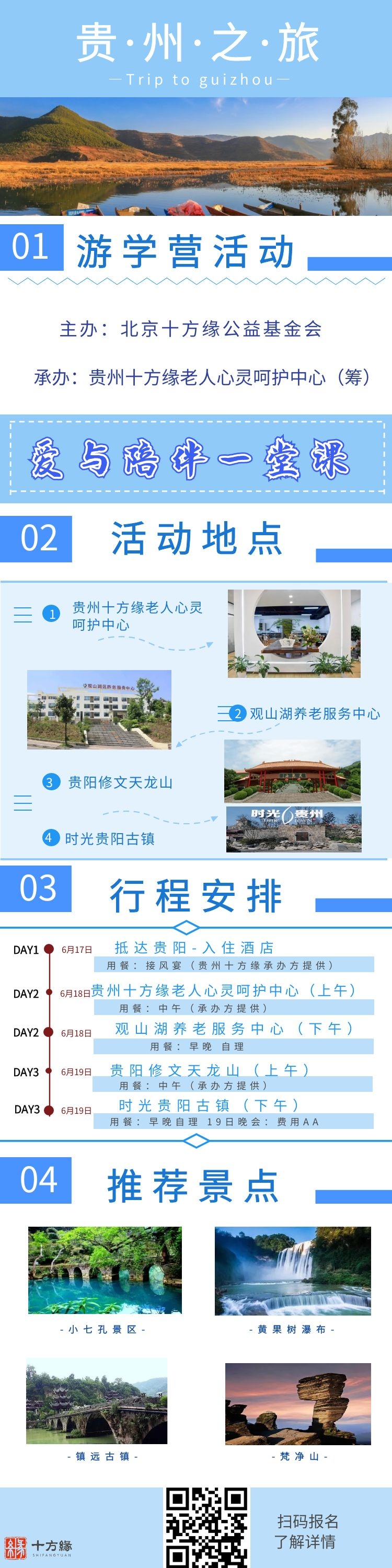 021年6月18日-19日 由北京十方缘公益基金会基金会主办、贵州十方缘老人心灵呵护中心承办的“爱与陪伴一堂课游学营”活动,将在避暑胜地——贵阳举办。