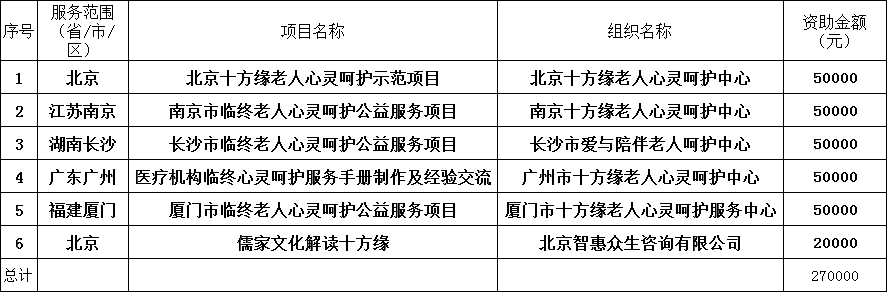 北京十方缘公益基金会在2016年除了通过“爱与陪伴”项目资助初创期的老人心灵呵护组织,还资助了成长期的老人心灵呵护机构,支持全国各地为老服务事业。让更多人参与到为重症、临终老人提供心灵呵护服务中来,让每一位老人在宁静祥和中走完人生的最后路程。