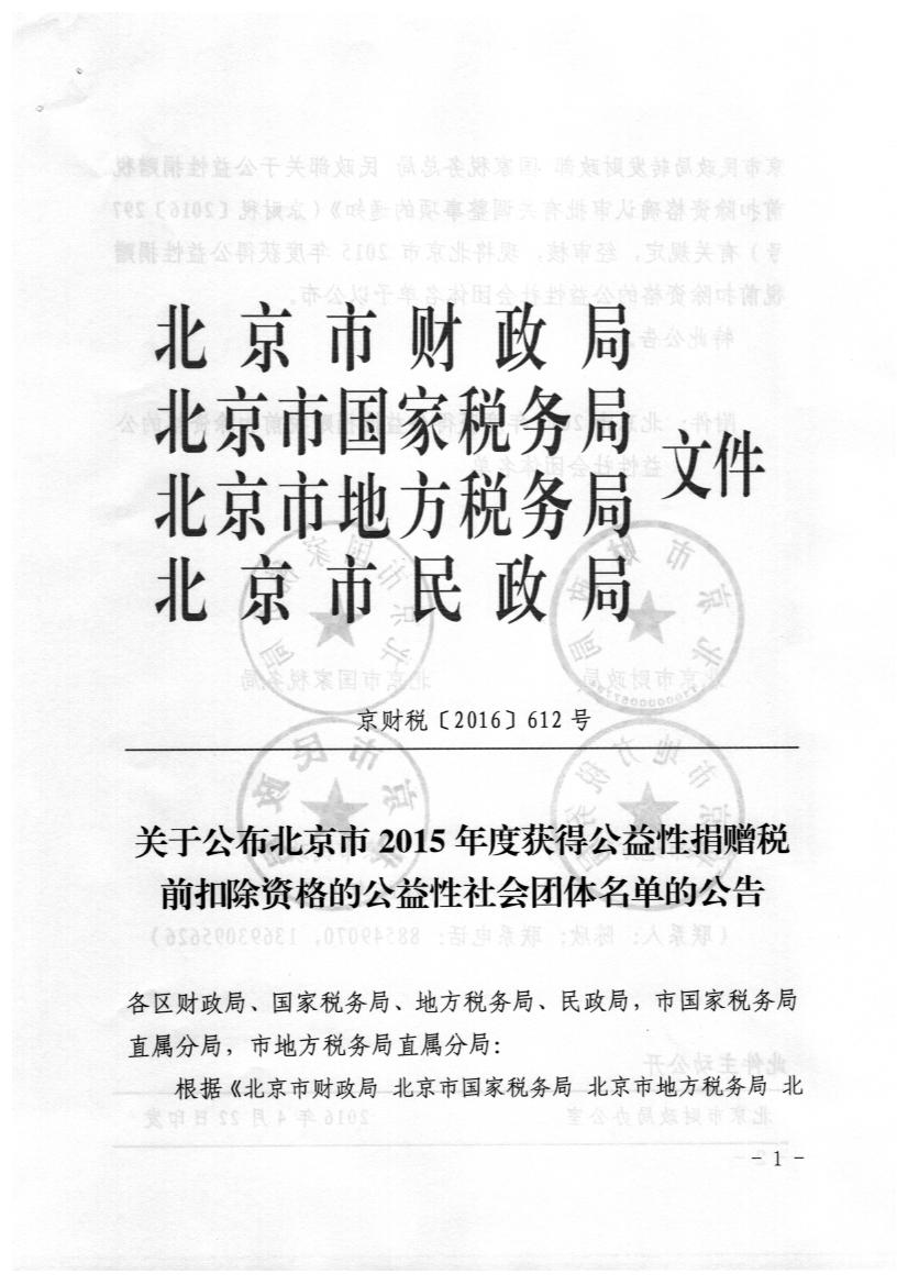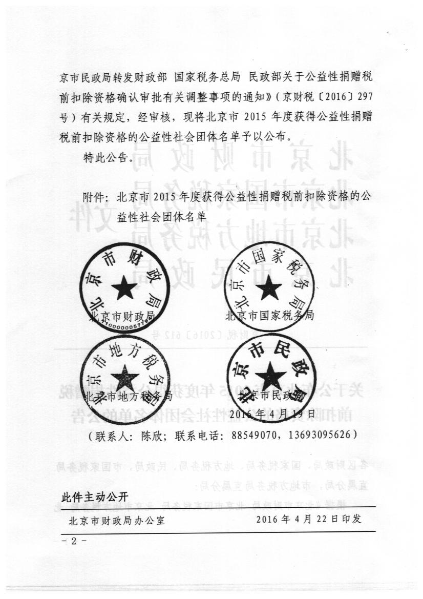 十方缘基金会获得北京市2015年度获得公益性捐赠税前扣除资格