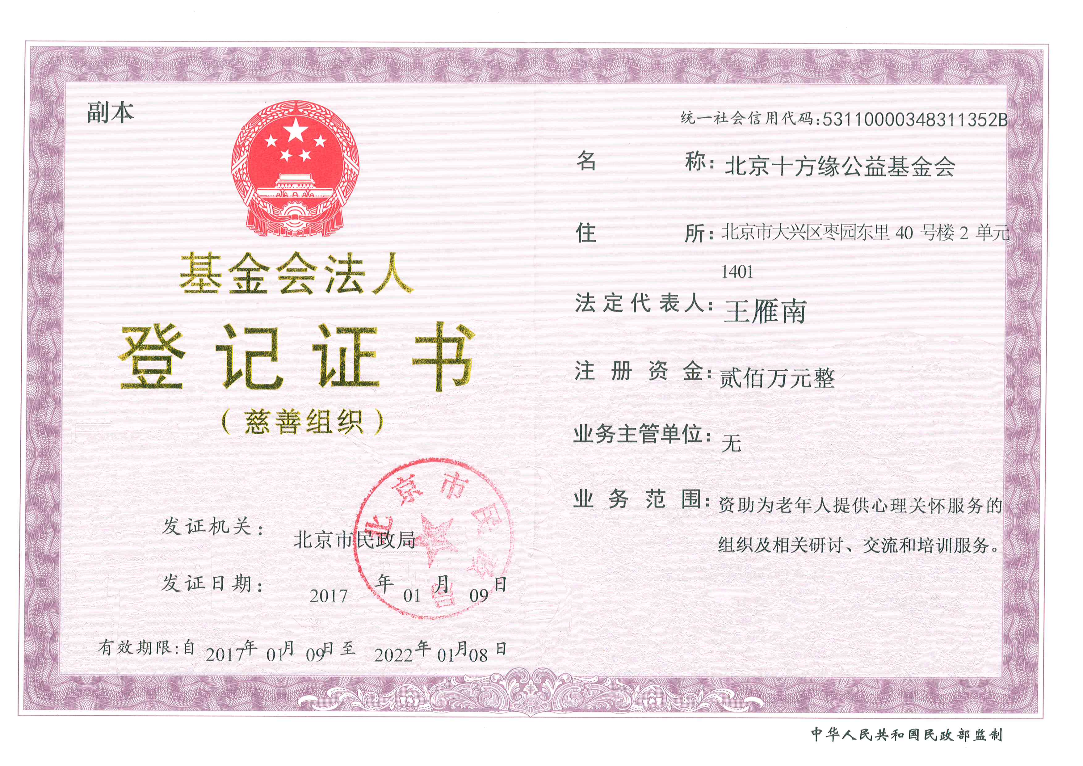 2017年1月十方缘基金会完成慈善组织认定工作。