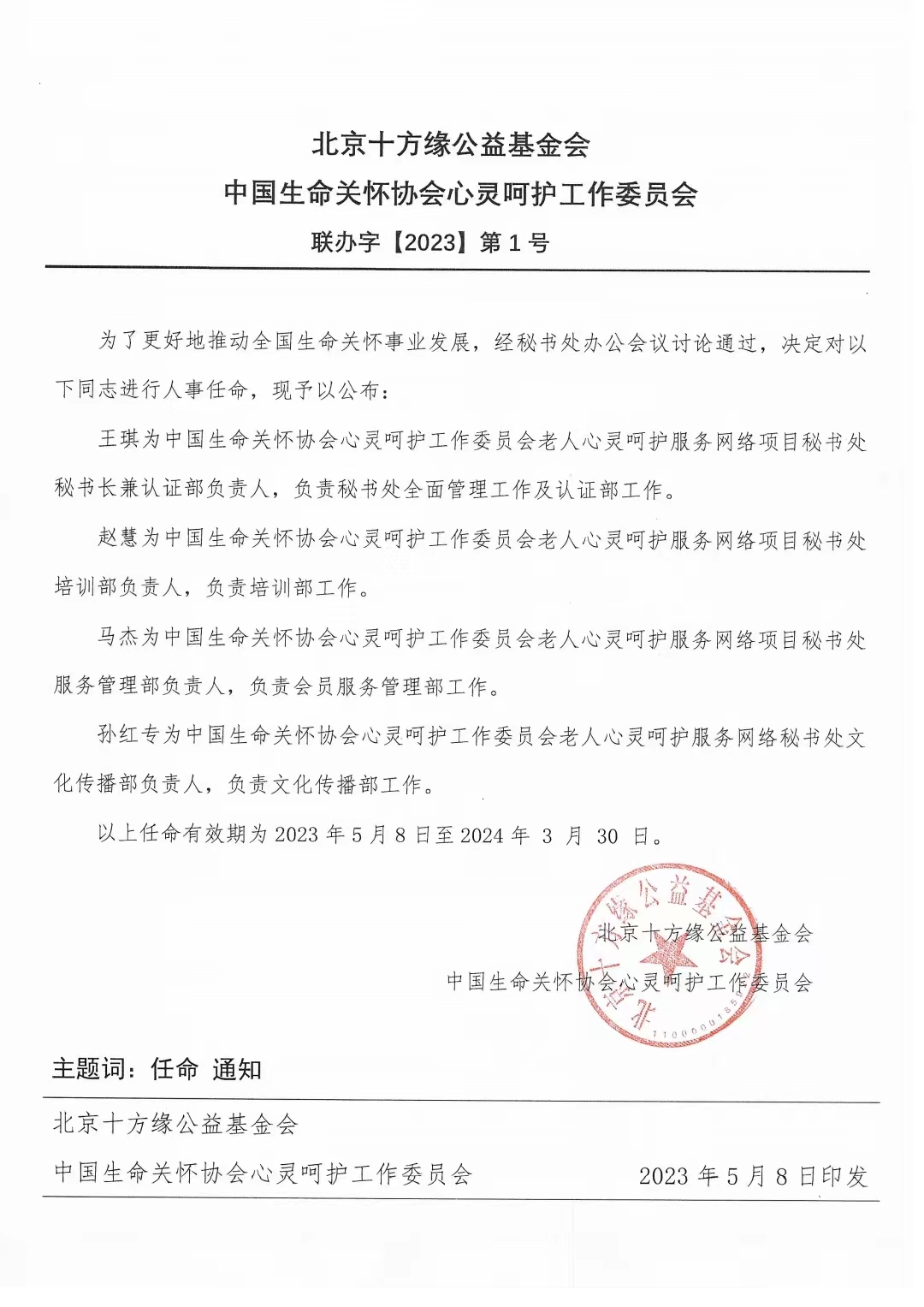 中国生命关怀协会心灵呵护工作委员会老人心灵呵护服务网络秘书处任命书