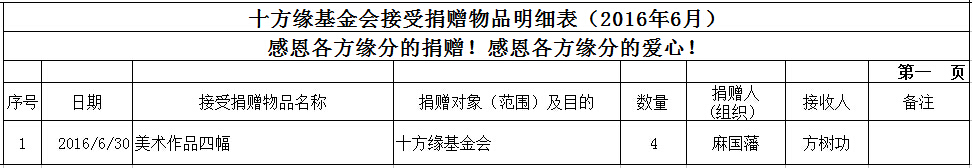 十方缘基金会接受捐赠物品明细表(2016年6月)